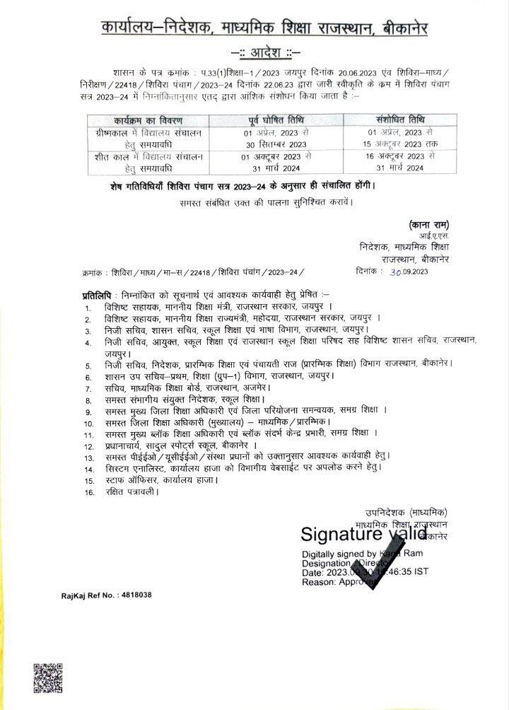 राजस्थान स्कूल शिक्षा विभाग के ऑफिशियल नोटिस के अनुसार, ‘माध्यमिक शिक्षा राजस्थान, बीकानेर द्वारा राजकीय विद्यालयों में 1 अक्टूबर से बदलने वाले शीतकालीन समय को 15 अक्टूबर तक स्थगित किया गया है. शीतकालीन समय 10 से 4 बजे का होता है जिसे अब 16 अक्टूबर से लागू किया जाएगा. तब तक विद्यालयों का संचालन ग्रीष्मकालीन समय के अनुरूप ही रहेगा.’