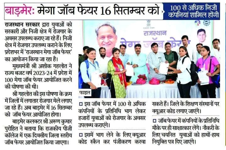 Rajasthan Mega Job Fair 2023 will be organized on 16 September 2023 at Barmer from 9:00 AM to 4:00 PM.