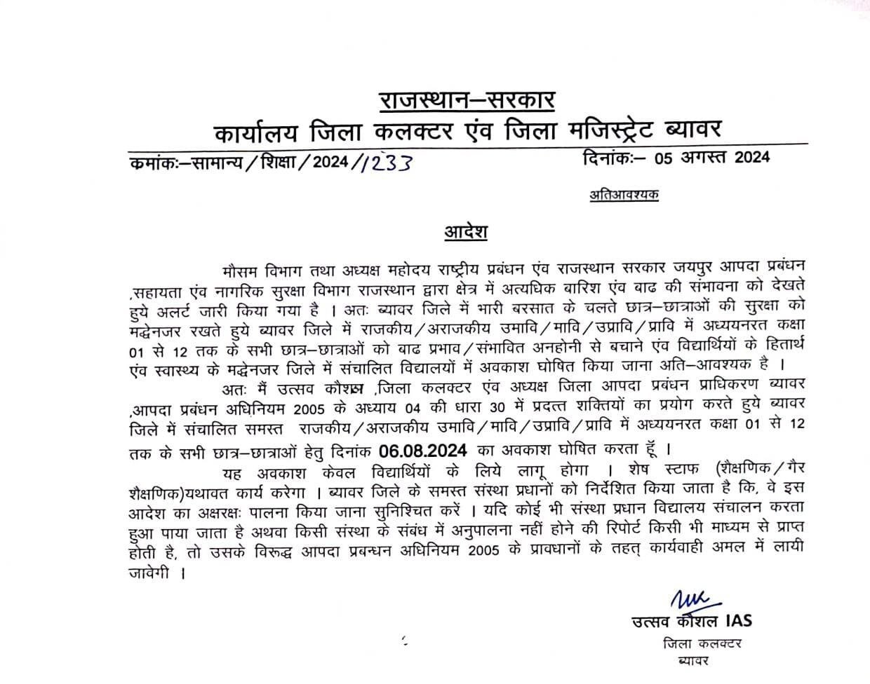ब्यावर जिले में 6 अगस्त को समस्त सरकारी और प्राइवेट स्कूलों में अवकाश घोषित कर दिया गया है। इसमें कक्षा 1 से लेकर 12 तक के विद्यार्थियों के लिए छुट्टी रहेगी।