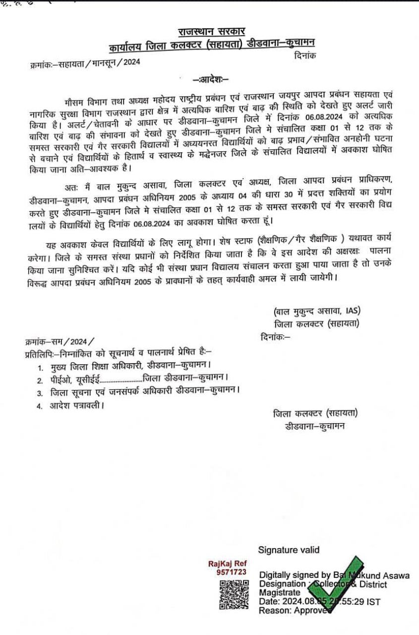 नागौर जिले में 6 अगस्त को स्कूलों में अवकाश घोषित कर दिया गया है। इसमें कक्षा 1 से लेकर 12 तक के विद्यार्थियों के लिए छुट्टी रहेगी।