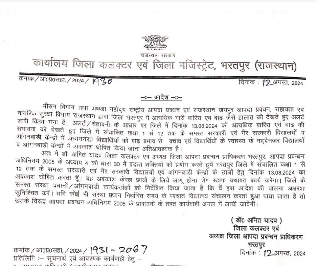 भरतपुर जिला स्कूल छुट्टी नोटिस