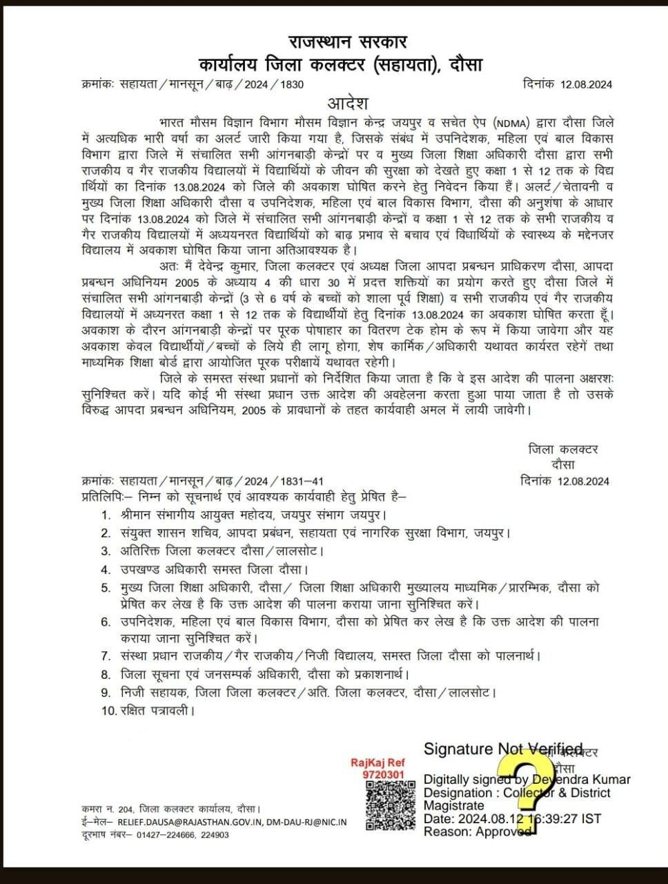 भरतपुर जिले में भारी बारिश को देखते हुए समस्त सरकारी और प्राइवेट स्कूलों एवं आंगनवाड़ी केंद्रों में 13 अगस्त को अवकाश घोषित कर दिया गया है। इसमें कक्षा 1 से लेकर 12 तक के विद्यार्थियों के लिए छुट्टी रहेगी।