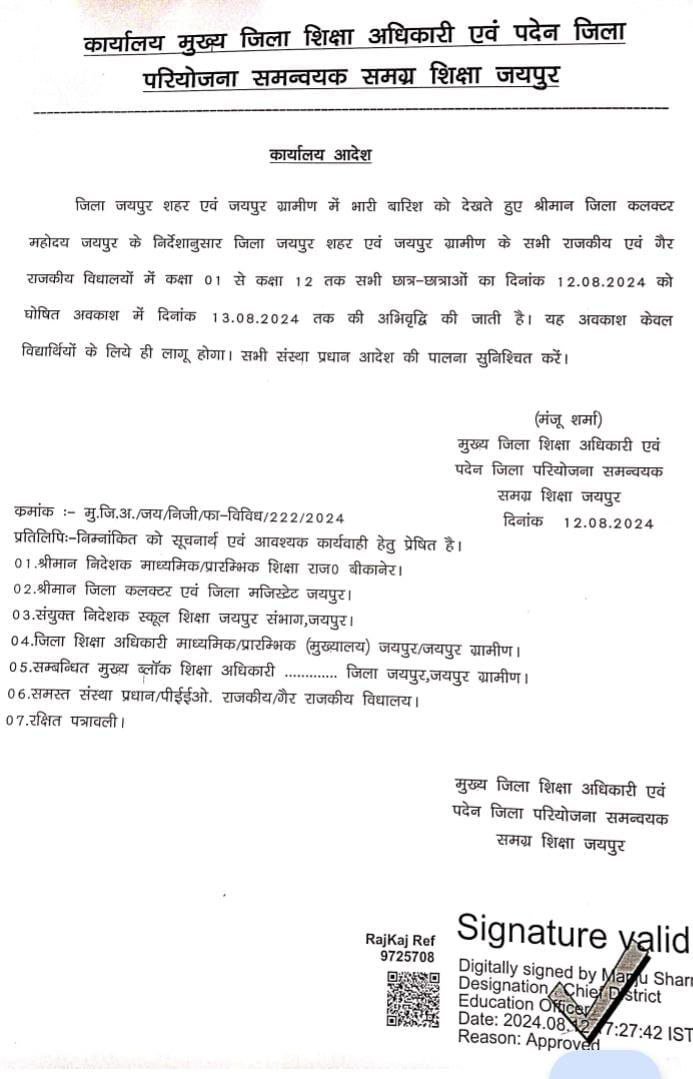 जयपुर शहर और जयपुर ग्रामीण में भारी बारिश को देखते हुए सरकारी और गैर सरकारी (प्राइवेट) स्कूलोें में 13 अगस्त को अवकाश घोषित कर दिया गया है। इसमें कक्षा 1 से लेकर 12 तक के विद्यार्थियों के लिए छुट्टी रहेगी।