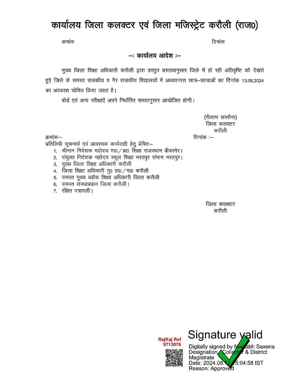करौली जिले में 13 अगस्त को स्कूलों में अवकाश घोषित कर दिया गया है। इसमें कक्षा 1 से लेकर 12 तक के विद्यार्थियों के लिए छुट्टी रहेगी। जिला कलक्टर ने यह आदेश जारी किया है।
