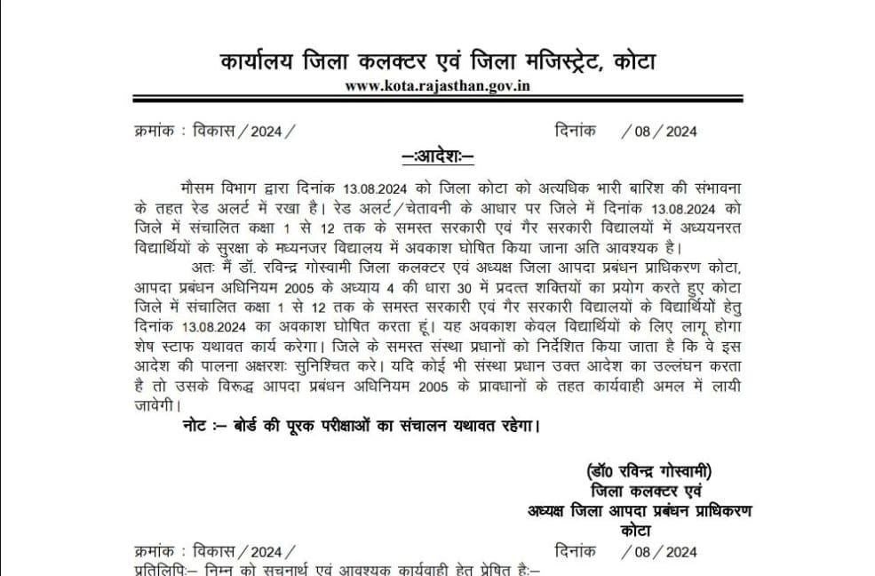 कोटा जिले में भारी बारिश को देखते हुए समस्त सरकारी और गैर सरकारी (प्राइवेट) स्कूलों में 13 अगस्त को अवकाश घोषित कर दिया गया है। इसमें कक्षा 1 से लेकर 12 तक के विद्यार्थियों के लिए छुट्टी रहेगी।