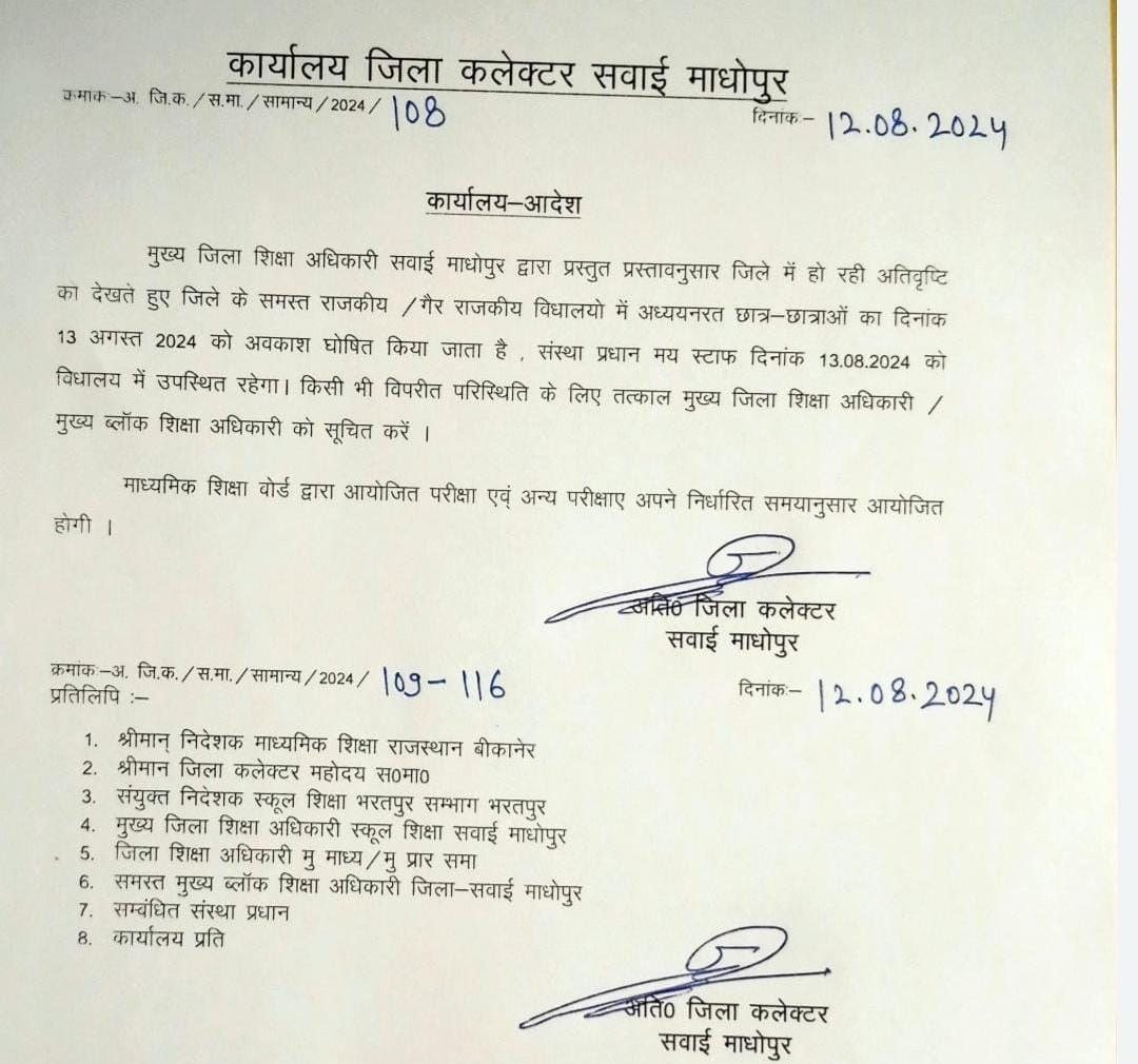 सवाई माधोपुर जिले में भारी बारिश को देखते हुए समस्त सरकारी और गैर सरकारी (प्राइवेट) स्कूलों में 13 अगस्त को अवकाश घोषित कर दिया गया है। इसमें कक्षा 1 से लेकर 12 तक के विद्यार्थियों के लिए छुट्टी रहेगी।