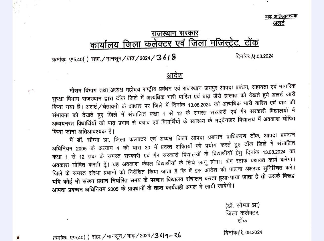टोंक जिले में भारी बारिश को देखते हुए समस्त सरकारी और गैर सरकारी (प्राइवेट) स्कूलों में 13 अगस्त को अवकाश घोषित कर दिया गया है। इसमें कक्षा 1 से लेकर 12 तक के विद्यार्थियों के लिए छुट्टी रहेगी।